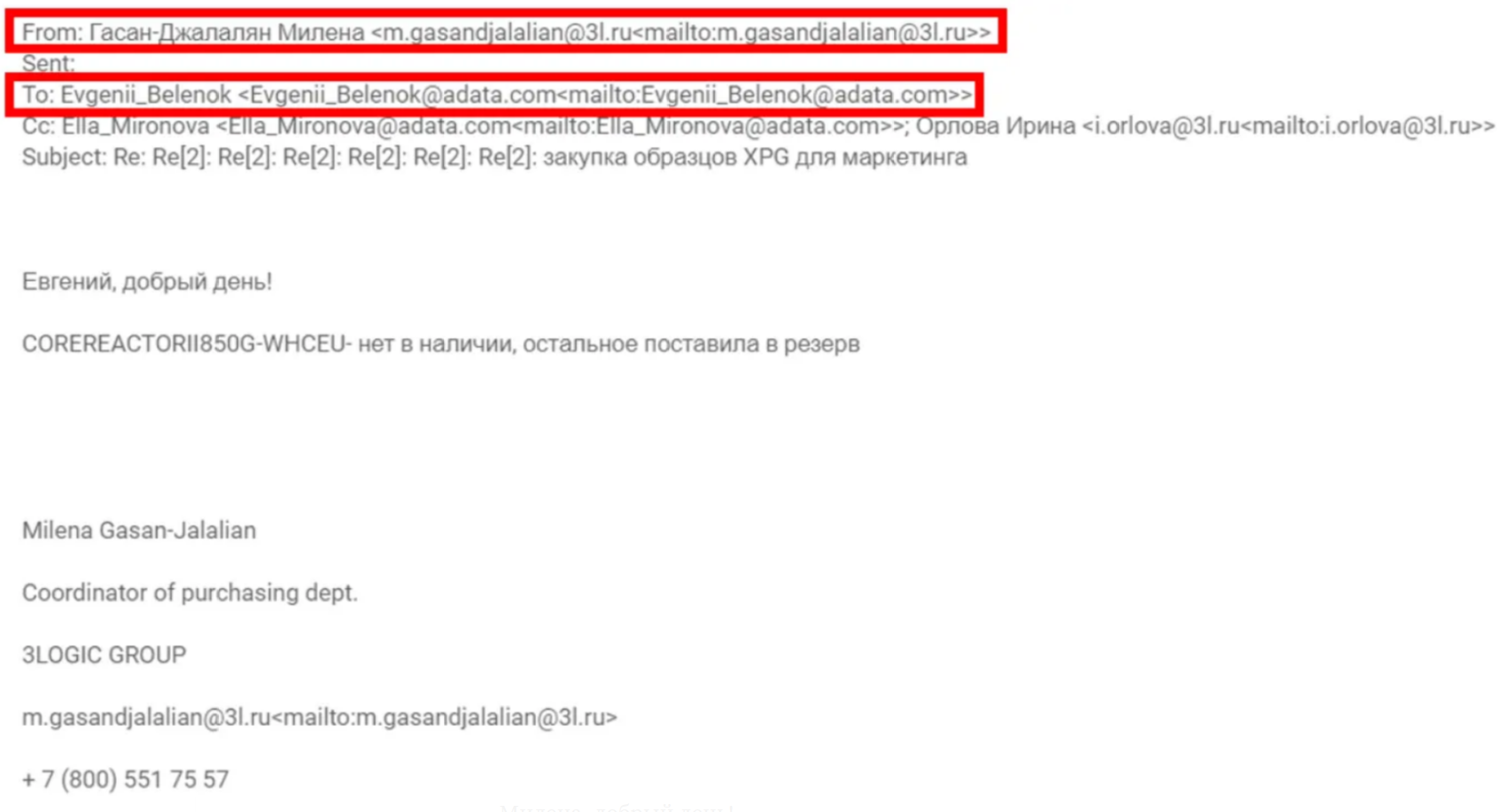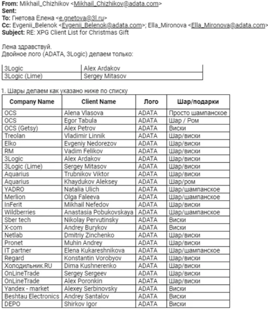 Among all these telling documents Truffle gave us access to a wonderful Christmas present: Adata’s favorite clients list. The email below is an exchange between Mikhail Chizhikov from Adata and Elena Gnetova from 3Logic Group. They openly exchange about a gift list for Christmas for their main business partners and guess who’s here? More war-sanctioned clients.