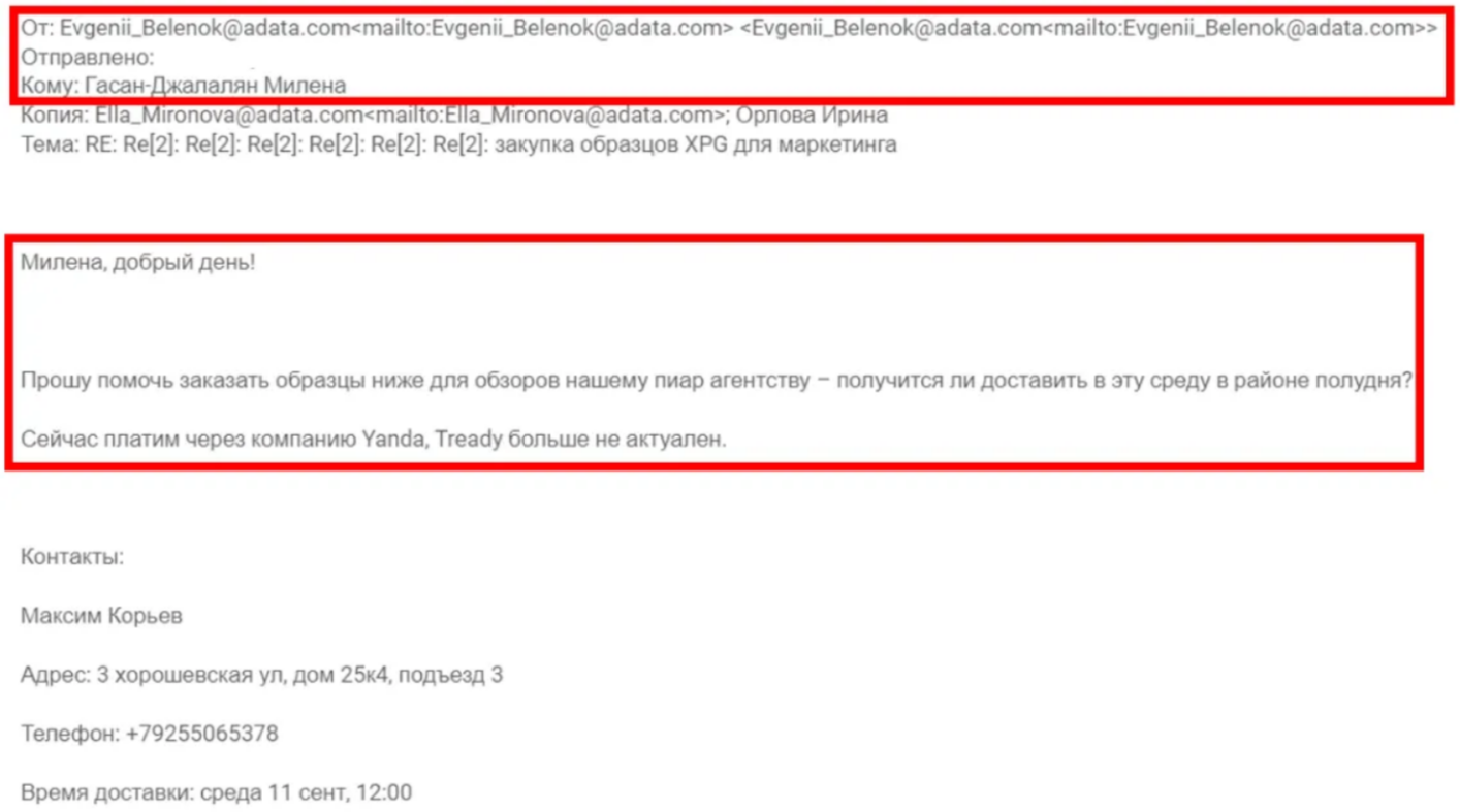 After AB-Trade LLC and before Yanda, Adata and 3Logic Group also worked with Tready Co. — FZCO, a company based in Dubai (Dubai Silicom Oasis, DDP, Building A1, Dubai). This firm was mentioned in the mail exchange between Evgenii (Adata) and Milena (3Logic Group) as “not relevant” anymore. It was specialized in the trade of computers, servers, printing equipment but also medical device and — main interest for Adata-3Logic — was not sanctioned…yet! It appears though the Russians stopped this partnership quite recently in favor of the Chinese one.