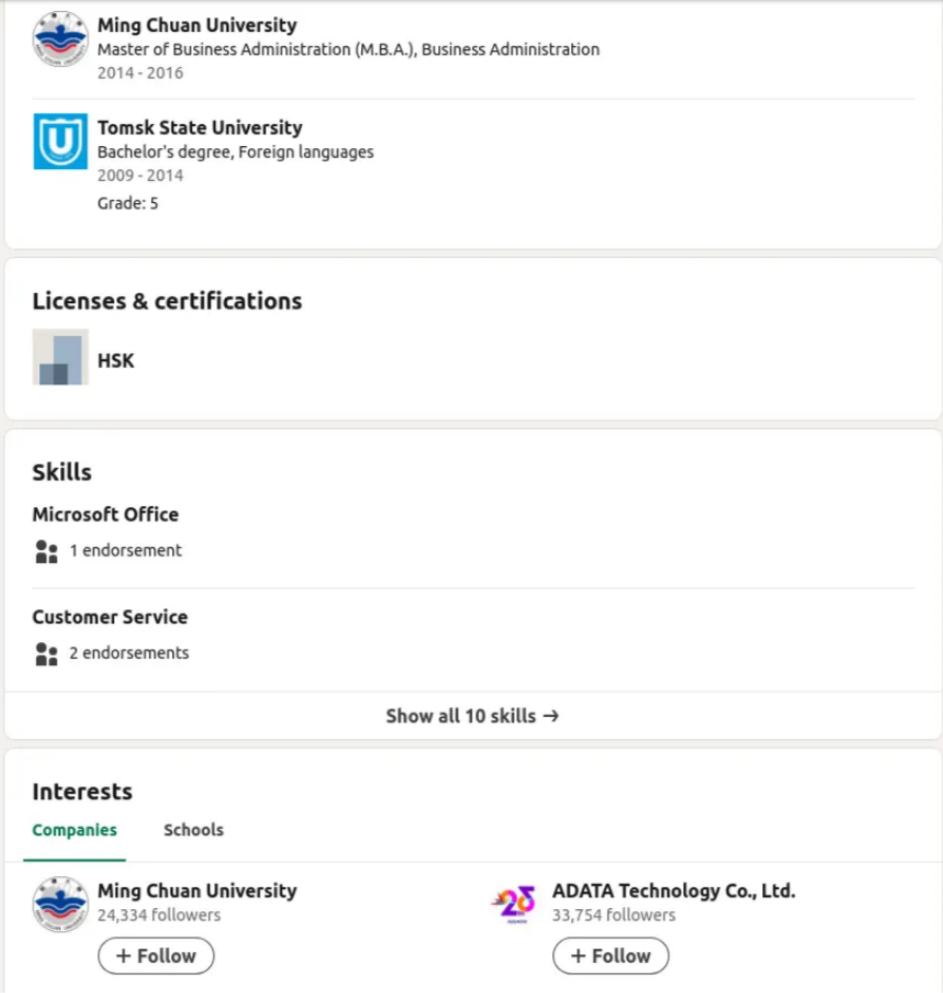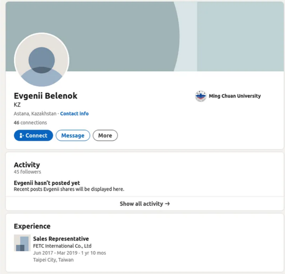 There’s a LinkedIn account belonging to a “Evegnii Belenok” who did work in Taiwan and ranks Adata Technology’s LinkedIn business page among his interests. Though it doesn’t specify he actually works for Adata, one might properly assume we spotted the right guy. Among other things, we learnt Evegnii studied at the Taiwanese Ming Chuan University (hence working for a Taiwanese company afterwards?) and might be from Kazakhstan (like so many individuals helping Russia, see our investigation on KazUAV).