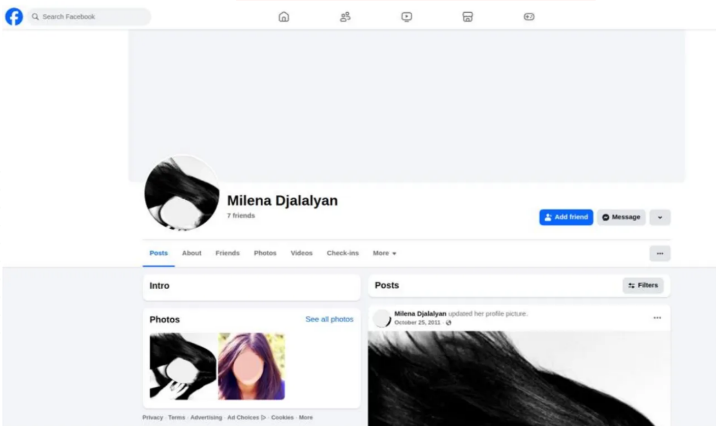 We found a Facebook account belonging to Milena Djalalyan (not the same writing) but failed to find conclusive evidence this might match our lady!