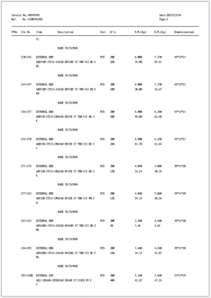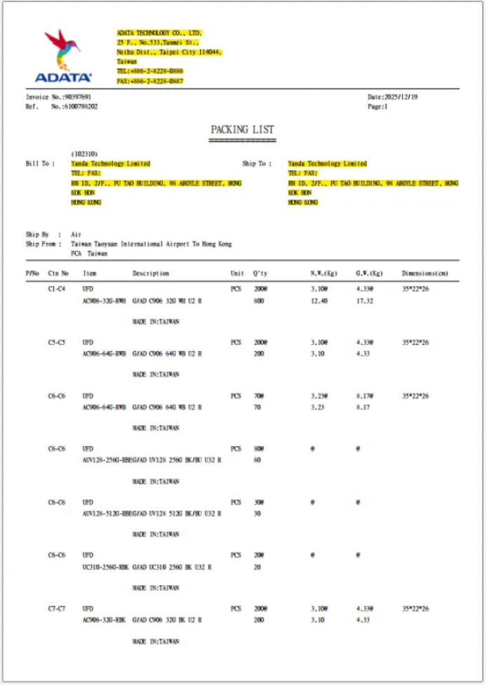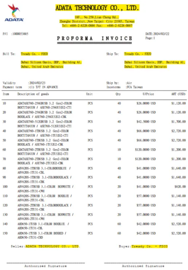 Invoice from Adata to Yanda about external HDD