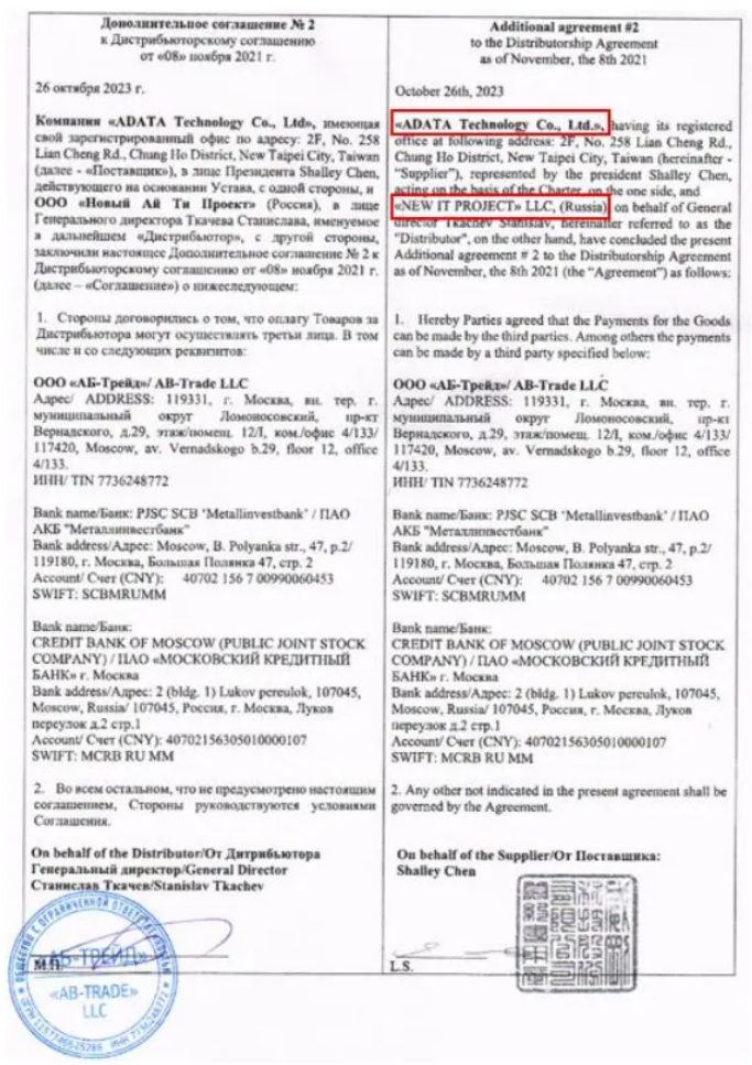 Remember that 3Logic Group is sanctioned since September 2023. It did not take them very long to find a loophole to keep its business running despite U.S. sanctions. The data provided by our whistleblower helped us understand and illustrate this. On October 2023, Adata Technology and 3Logic Group signed an additional deal to their distributorship agreement, allowing “payment for the goods to be made by third-parties”. This contract below concerned the use of Russian import and export firm AB-Trade LLC.