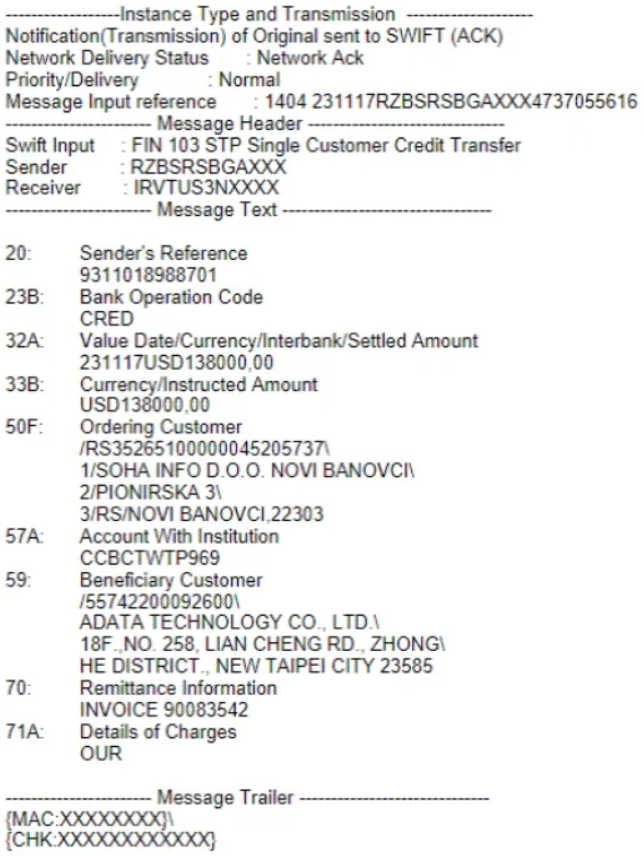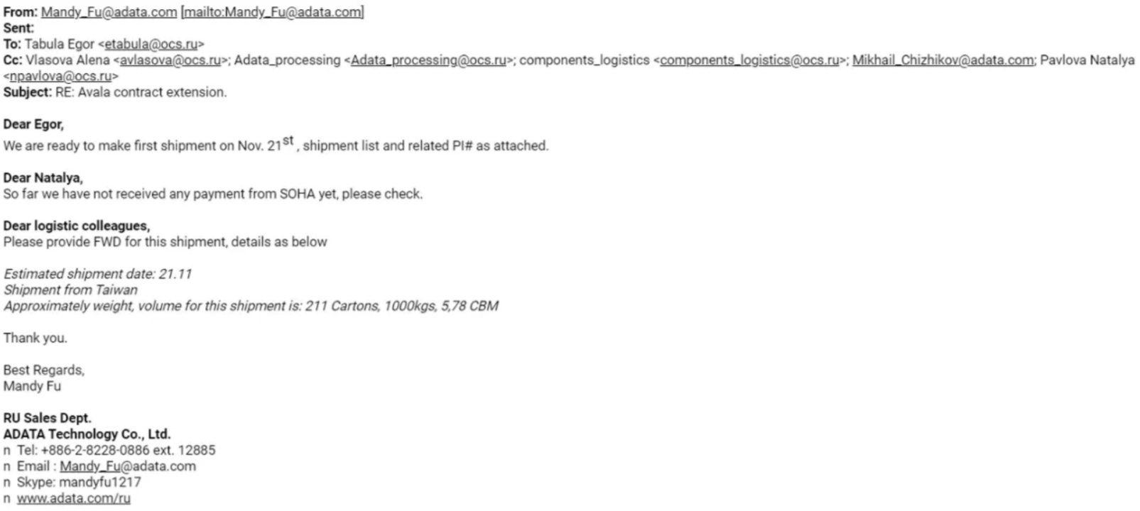 In addition of Yanda and AB-Trade LLC, we accessed other documents from Adata assessing the company is repeating the same scheme with many other sanctioned companies in total impunity. An e-mail exchange between the lovely Mandy Fu from Adata to the delightful Tabula Egor from the Russian sanctioned company OCS Distribution mentions a payment through two Serbian firms Avala Informatikaand Soha Info (Soha is sanctioned since October 2022).