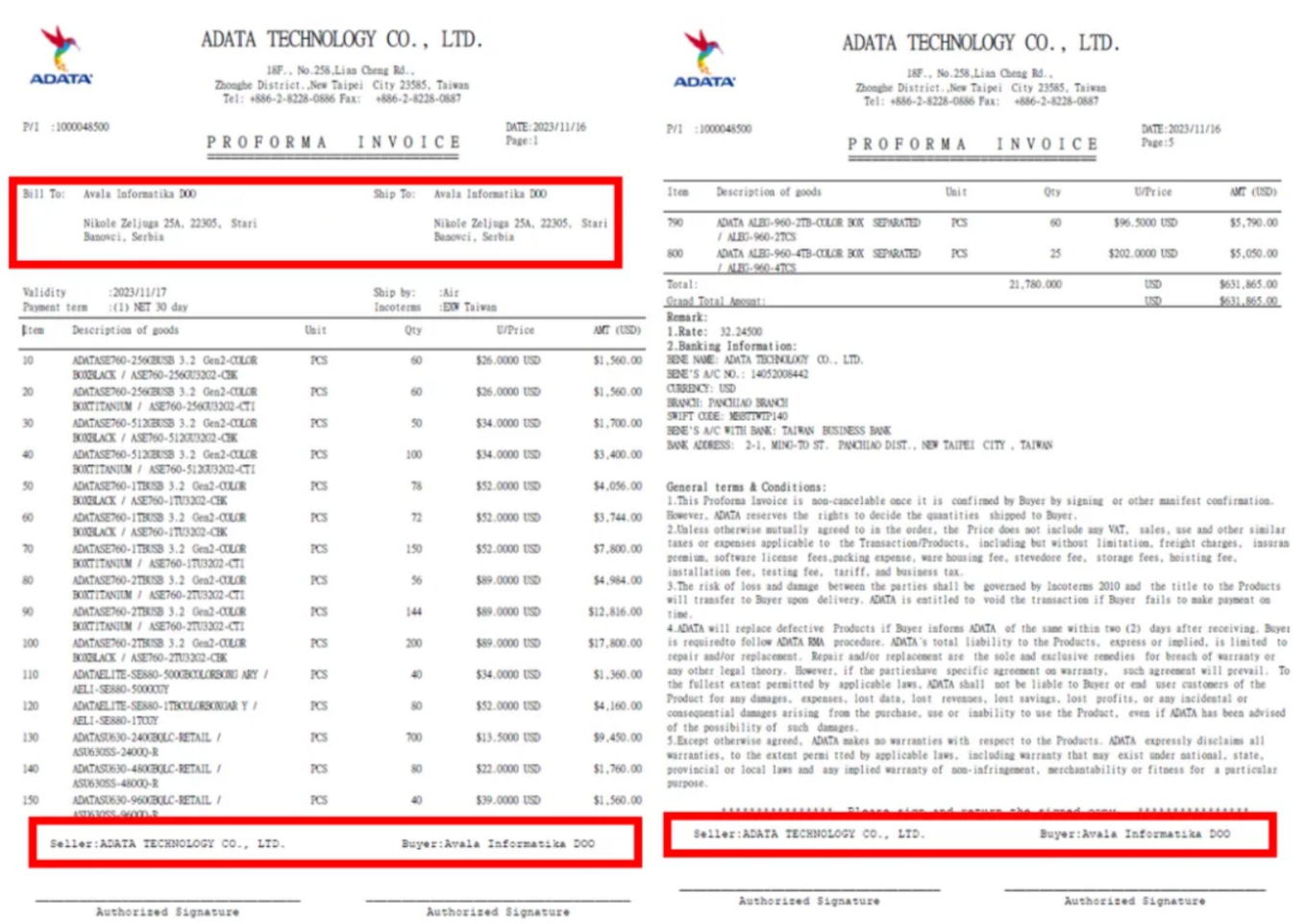 Invoice from Adata to Avala Informatika