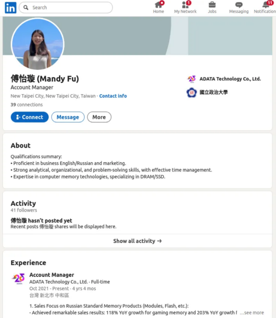 We easily found Mandy Fu’s LinkedIn profile, who seems to be remarkably open about her focus on Russian products!